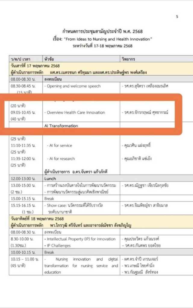 The session provided insights into current trends, emerging technologies, and interdisciplinary approaches shaping healthcare innovation. Dr. Suthakorn expressed appreciation to Assoc. Prof. Dr. Kantaporn Yodchai, President of the Association, for the invitation and the opportunity to share experiences with the professional nursing and healthcare community.