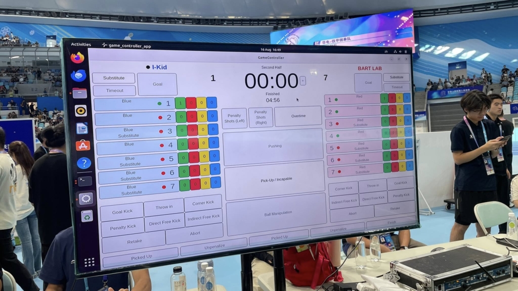 The second match against GeoHBot saw improved balance between speed and accuracy. BART LAB led 1–0 in the first half, but a mid-game connectivity issue disrupted one robot’s link to the referee control system. After several technical fixes, the backup robot was deployed but suffered similar instability, ending in another 5–1 loss.