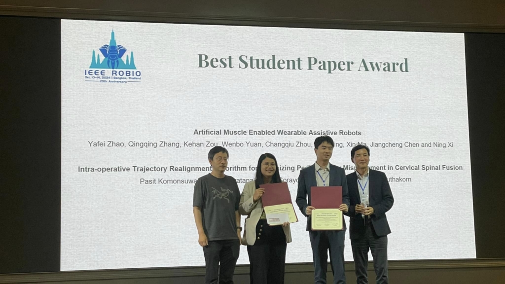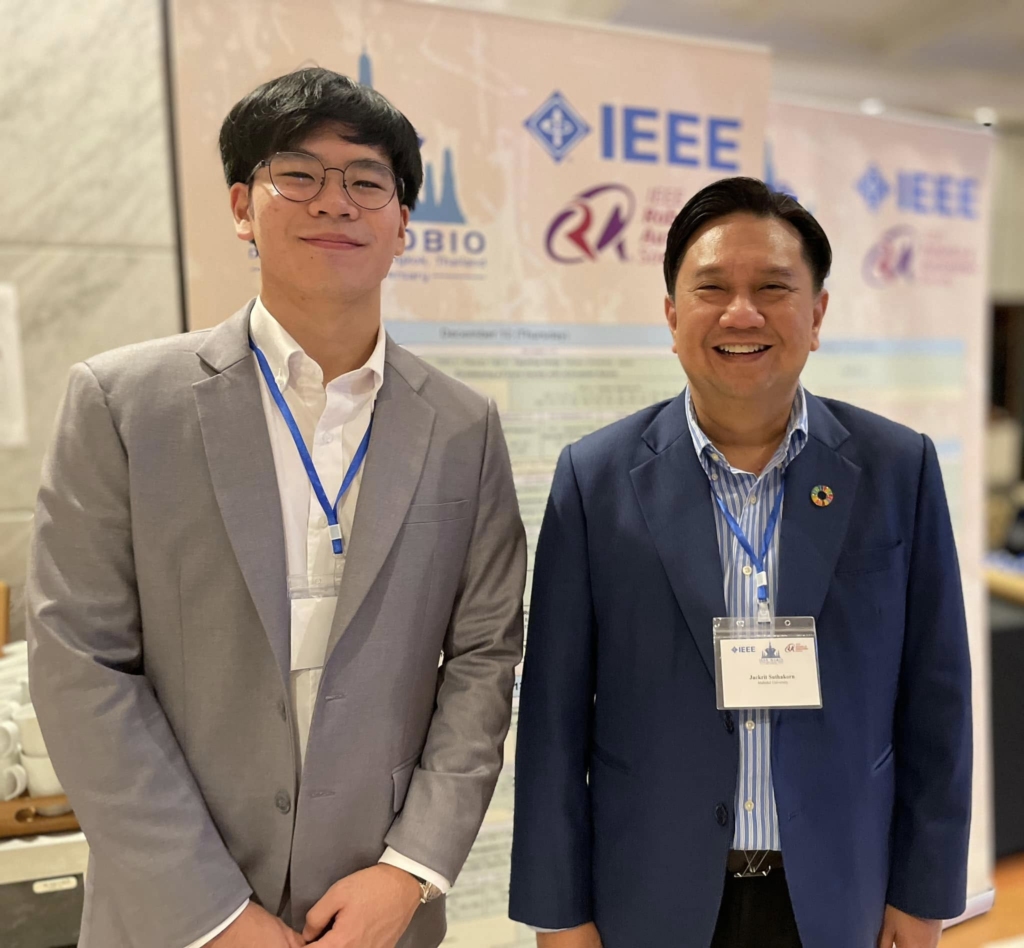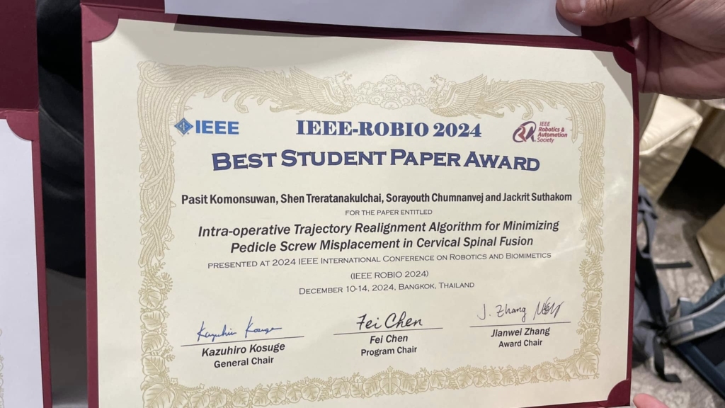 December 12, 2024 – Pan-Pisit Komonsuwan, a student in the MD-MEng dual-degree program at Mahidol University, under the supervision of Assoc. Prof. Dr. Jackrit Suthakorn, was awarded the prestigious Best Student Paper Award at the 20th IEEE International Conference on Robotics and Biomimetics (IEEE ROBIO 2024). His paper was selected from among 399 submissions from around the world.