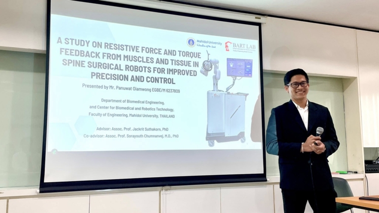 Mr. Panuwat Oiamwong successfully defended his master’s thesis on spine surgical robot force–torque feedback, becoming BART LAB’s 28th master’s graduate under Dr. Jackrit Suthakorn’s supervision.